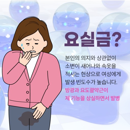 요실금은 내 의도와는 달리 또 의도하지 않게 때와 장소를 가리지 않고 소변이 새는 증상을 말하며 여러 가지 요인에 의해 발생할 수 있습니다.