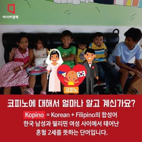 코피노(Kopino)는 한국인의 영어 코리안(Korean)과 필리핀인의 필리피노(Filipino)의 합성어로 유학, 어학연수, 개인 사업, 주재 파견, 근로, 관광 등으로 필리핀에 체류하는 한국 남성과 필리핀 현지 여성의 교제나 동거 또는 성매매 등을 통하여 태어난 자녀를 필리핀 현지에서 일컫는 속어입니다.