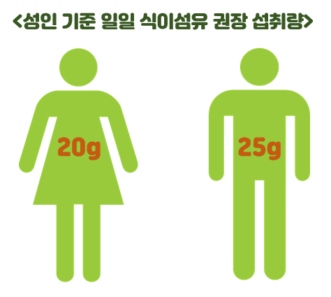 성인 기준으로 여성은 20g 남성은 25g을 권장합니다. 수용성 식이섬유와 불용성 식이섬유를 1:3의 비율로 먹는 것이 바람직한 식이섬유 섭취 비율이라고 합니다. 하루 권장량은 꼭 먹도록 노력해야겠습니다.