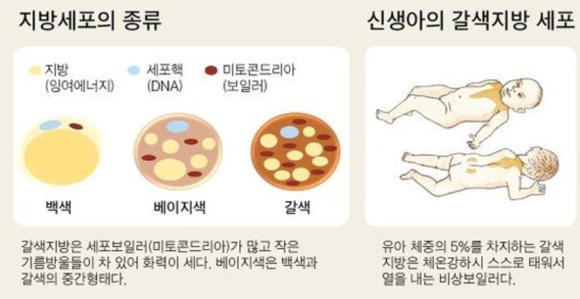갈색지방 : 열을 발산해 체온을 유지하고 추위에 적응하도록 돕는 작용을 합니다. 직접 열을 생산하기 때문에 신생아나 겨울잠을 자는 동물들에게 많습니다. 비만의 원인이 되는 지방을 연소시키는 역할을 합니다.