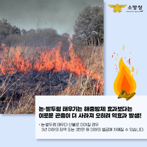 봄이면 관행처럼 해오던 일이었지만 농촌진흥청은 해충 방제에 도움이 되지 않는다고 합니다. 해충 6종(벼멸구, 애멸구, 혹명나방, 흰 등멸구, 먹노린재, 벼물바구미) 발생에 큰 차이가 없었고 해충 태우려다 익충까지 함께 죽는다고 합니다. 또한 논밭두렁 태우는 일은 불법이며 어기면 최대 100만 원의 과태료가 부과됩니다. 잘못 태우다 산불로 이어지면 산림법에 따라 3년 이하 징역 또는 3000만 원 이하 벌금형에 처해진다고 하니 지금 시대에는 태우지 않는 게 여러모로 좋겠습니다.