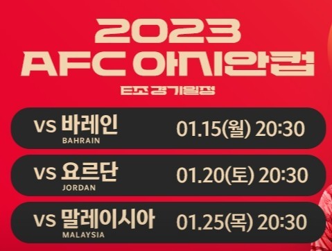 이미 두 경기는 끝났다. 현재 카타르에서 2023 AFC 카타르 아시안컵 경기가 한창 진행 중이다. 6개의 조 중에서 대한민국 은 바레인, 요르단, 말레이시아와 E조에 속해있다. 바레인과 요르단과는 이미 경기를 치렀고 마지막 3차전 말레이시아와 경기를 앞두고 있다. 그 경기가 바로 돌아오는 목요일 25일 저녁 8시 30분에 중계된다.